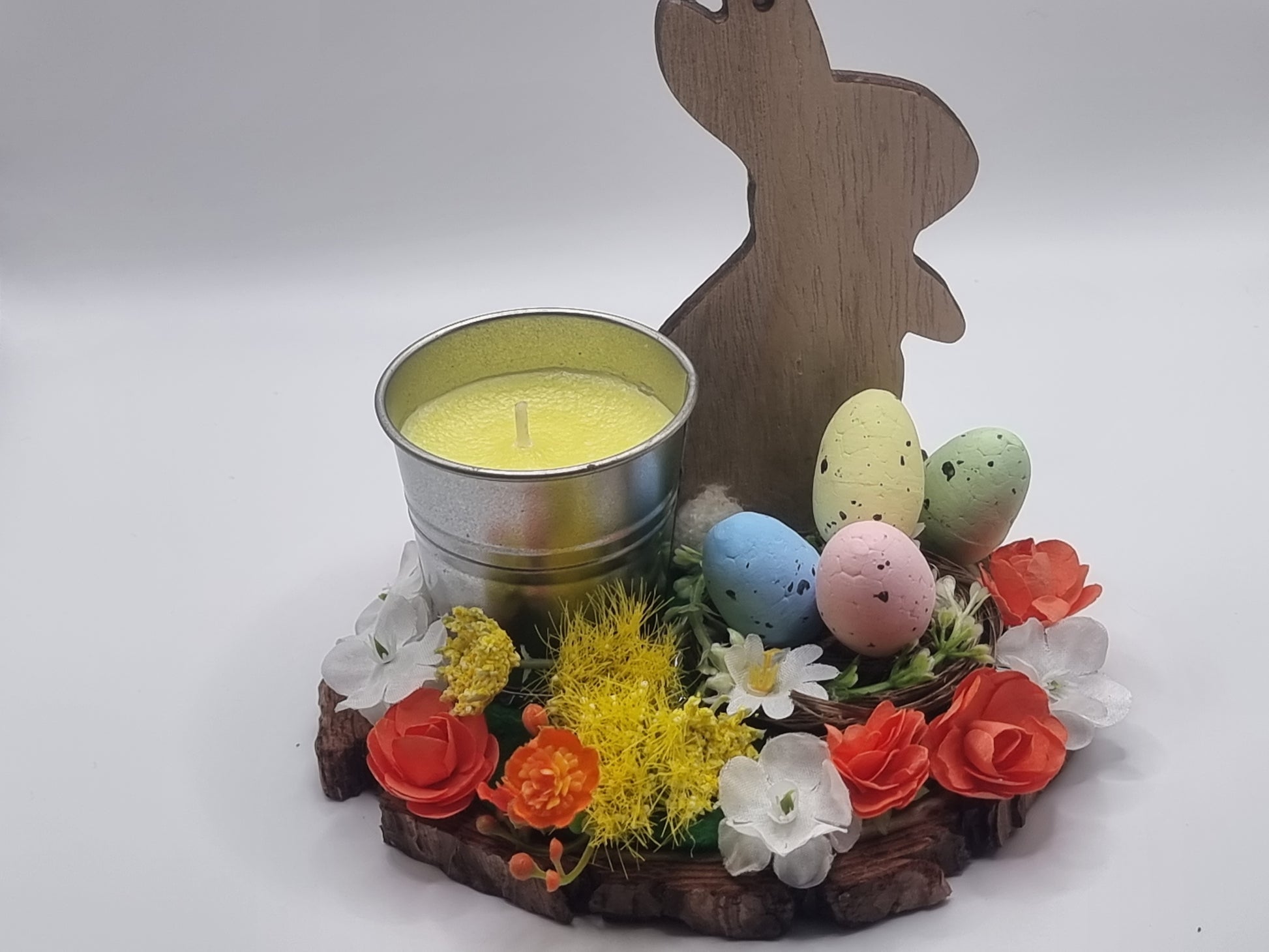 13cm wooden slice decorated with flowers,wooden bunny ,lemon scented candle